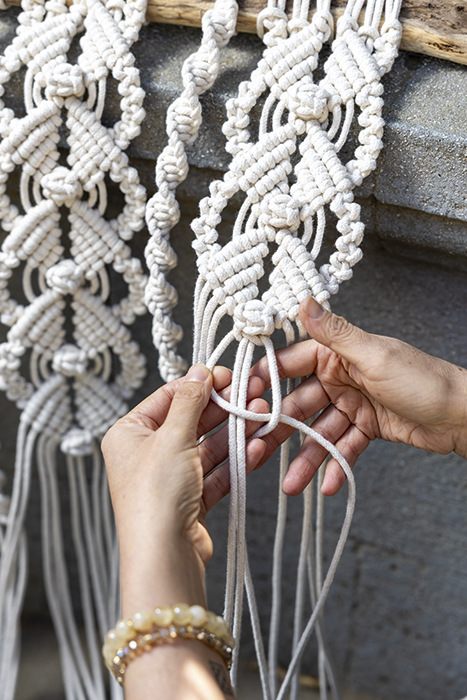 Probé varias cosas, pero el macramé me dio una sensación de libertad total. Es infinito. Puedes hacer decoración, vestuario, accesorios, piezas utilitarias o artísticas. Sentí que nunca me iba a aburrir. Además, estéticamente conectaba mucho conmigo, por los tonos neutros, lo bohemio, lo natural.